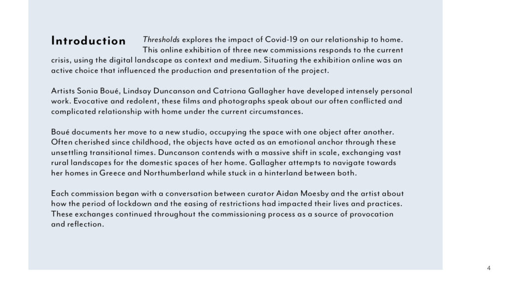 Thresholds is a digital exhibition that explores the impact of Covid-19 on relationships to home. Curator Aidan Moesby commissioned artists Sonia Boué, Lindsay Duncanson and Catriona Gallagher to develop new films and photographs in response to their experiences of 2020. The exhibition includes an essay by writer and academic Jade French co-commissioned with Corridor8.